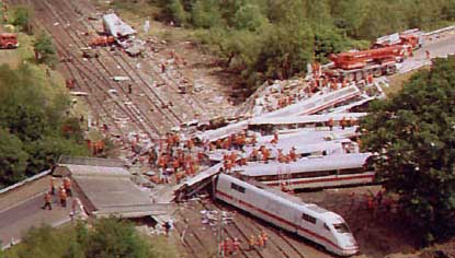 Beim Unfall des ICE "Wilhelm Conrad Röntgen" am 3. Juni 1998 kamen 101 Fahrgäste ums Leben, 105 wurden zum Teil schwer verletzt. An Schadensersatz hat die Bahn bis zum Jahr 2001 rund 42 Millionen DM gezahlt. Und auch die Materialschäden gehen in die Millionen. |