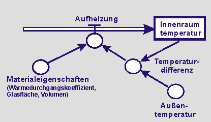 Wir beginnen mit einem einfachen Aufheizmodell. In diesem Modell ist die Innenraumtemperatur T die Zustandsgröße und die Aufheizung A die Flussgröße. Die Außentemperatur TA und die Materialeigenschaft m sind Konstante.