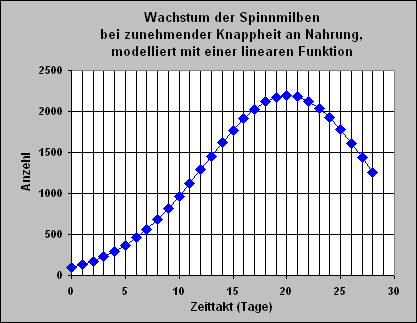 Die Spinnmilbenpopulation wächst zunächst ständig schneller, solange genügend Nahrung vorhanden ist. Wird aber die Nahrungsmenge stetig knapper oder steigt die Nahrungsknappheit, so wächst die Population immer weniger. Sie erreicht schließlich ein Maximum und sinkt dann ggf. sehr schnell bis zum Aussterben ab.