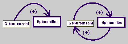 Das zweite Wirkungsdiagramm zeigt, dass die zunehmende Anzahl der Spinnmilben auch positiv auf die Geburtenzahl zurückwirkt. Denn je mehr Spinnmilben leben, desto mehr Geburten wird es geben. Das Wachstum der Spinnmilben ist über die Geburtenzahl positiv rückgekoppelt.