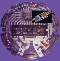 Schwingender Kristal (oben rechts) in einer Digitaluhr |