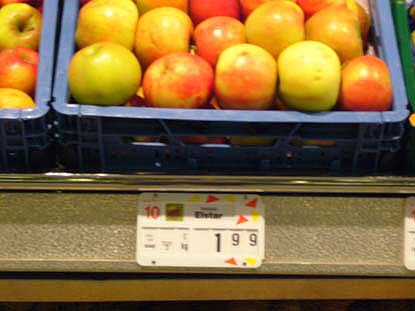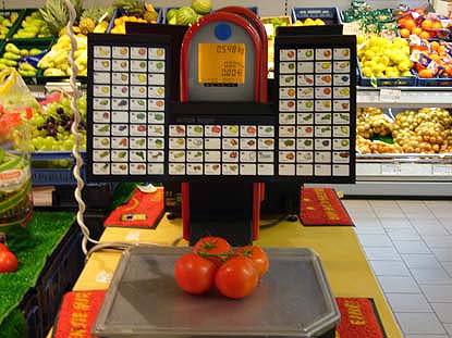 Heute müssen die KäuferInnen die Ware selbst auswiegen und die Kosten über eine Bilddatei ausdrucken. Der Ausdruck ist dann mit einem Strichkode versehen, den die Kassiererin an der Kasse einließt. |