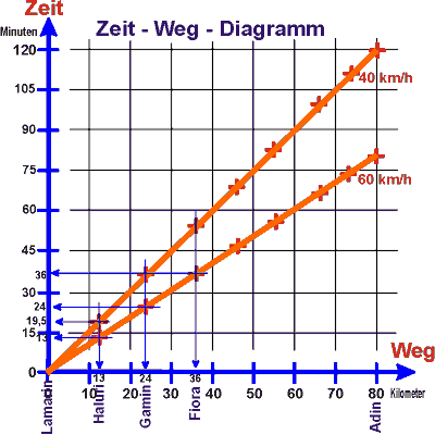 Aus den Graphen lässt sich ablesen, wie viel Zeit z.B. ein Zug für einen bestimmten Weg gebraucht hat.