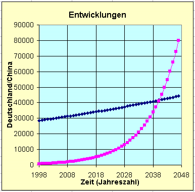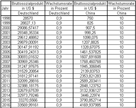 China braucht unter der obigen Annahme 41 Jahre um mit Deutschland gleich zu ziehen. Dann aber hat es bereits nach weiteren 8 Jahren das doppelte Bruttosozialprodukt wie in Deutschland. |