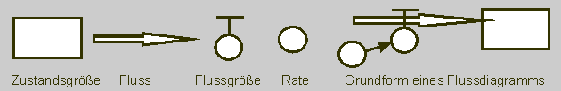Parameter, Konstante oder Funktionen wie z.B. Geburtenrate, Ansteckungszahl, Infektionsrate, Wachstumsrate, Konsumabnahmekoeffizient, Investitionskoeffizient, Kopplungsfaktor und Verzögerungsfaktor wirken auf die Flussgrößen ein. Die Grundform der Modellgleichung für eine Flussgröße lautet also: