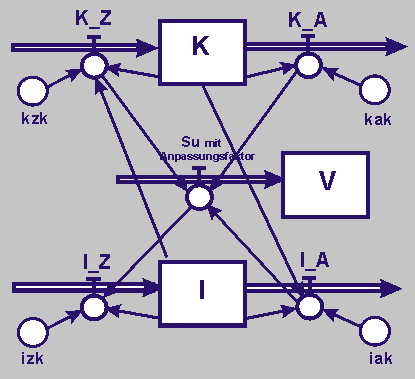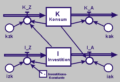 Da gibt es zunächst die beiden Zustandsgrößen Konsum (K) und Investition (I) sowie die vier Flussgrößen Konsum_Zunahme (Kz), Konsum_Abnahme (Ka), Investitions_Zunahme (Iz) und Investitions_Abnahme (Ia).