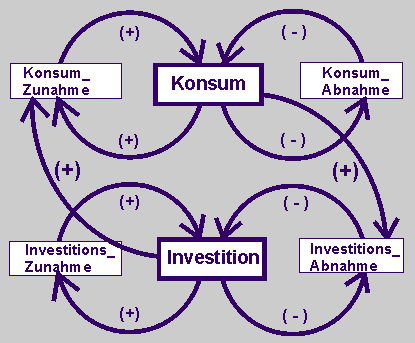 Darstellung der Wechselwirkungen zwischen Konsum und Investition in einem möglichen Wirkungsdiagramm.