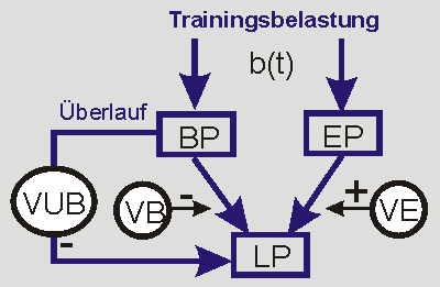 Zentral ist ein Leistungspotential LP(t), das über Flüsse in Abhängigkeit von einer Traingsbelastung b(t) verändert werden kann.