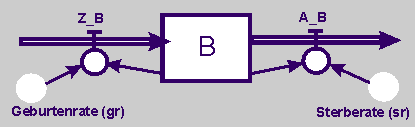 Es gibt also eine Zustandsgröße, die Bevölkerung (B). Auf diese wirken zwei Flussgrößen. Die Zunahme_Bevölkerung (Z_B) ist eine positive und die Abnahme_Bevölkerung (A_B) eine negative Rückkopplung. Die beiden Raten wirken ihrerseits auf die Flussgrößen. Mittels dieser Quantifizierung entsteht das folgende Flussdiagramm. |