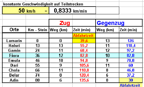 Die Excel-Tabelle wurde hier in der Abfahrtszeit des Zuges in Lamarin so verändert, dass sich der Zug und sein Gegenzug in Fiora (blau unterlegt) treffen.