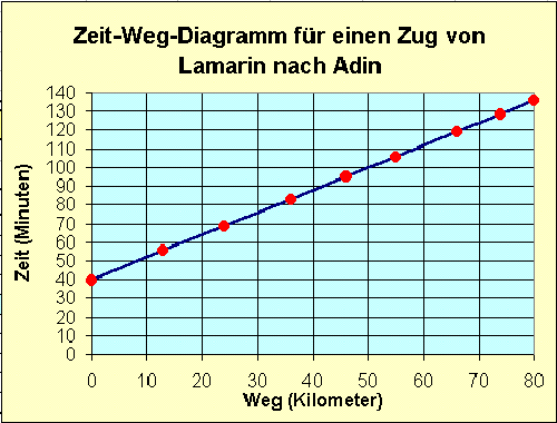 Werden die Diagramme für den Zug und seinen Gegenzug in derselben Weise formatiert, so lassen sich die Graphen übereinander legen. Dann sieht man, dass sich die Geraden am Kilometer-Ort Fiora schneiden. |