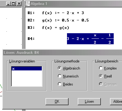 Es öffnet sich das nebenstehende Fenster "Lösen: Ausdruck #4". Für die Lösungsvariable x