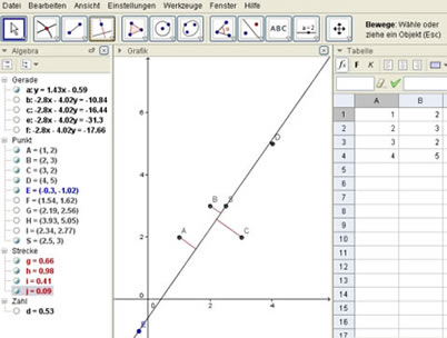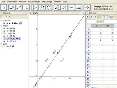 Wenn die vier Punkte A,B,C und D heißen, so gebt ihr nun S=(A+B+C+D)/4 in die Eingabezeile ein. Ihr habt nun den Punkt S konstruiert, dessen x-Koordinate der Durchschnitt aller x-Koordinaten und dessen y-Koordinate der Durchschnitt aller y-Koordinaten von A, B, C und D ist. Dieser Punkt liegt immer auf der Ausgleichsgerade.
