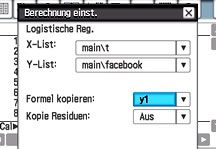 Zunächst klicken wir den Term hinter y1 = an, markieren mit Datei / alles auswählen den ganzen Term und kopieren ihn mit kopieren in die Zwischenablage. Anschließen geben wir einer neuen Spalte den Titel 'Modell' und klicken auf das Feld zur Eingabe eines Terms am Fuß der Liste. Nun klicken wir in das Eingabefeld hinter 'Cal =' und wählen Edit / einfügen.