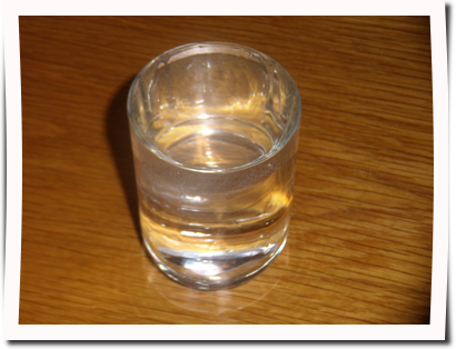 Wir geben einige Eiswürfel in  ein Glas. Wir füllen das Glas randvoll mit Wasser.