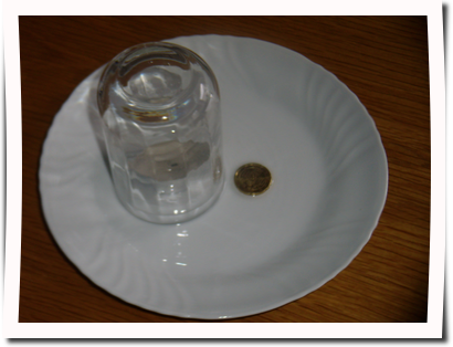 Wir gießen etwas Wasser auf einen Teller und legen eine Münze hinein.