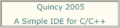 Quincy is freeware open-source. It is a simple programming environment for C/C++ on Windows. It contains an editor, a compiler, a debugger, and graphics and GUI toolkits.
