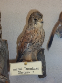 Foto von einem ausgestopften, männlichen Turmfalken, ausgestellt im Heimatmuseum Steinegg |